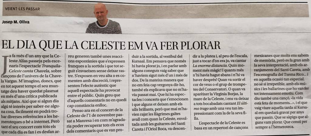 Crítica publicada al diari Regió7 sobre el concert teatralitzat Tranquila. Celeste canta Chavela, amb codramatúrgia d’un servidor amb el Martí Torres, que en firma la direcció.
